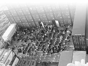 ![]() KriegsdienstverweigerInnen aus Afghanistan und dem Irak werden vom australischen Staat und Militär an der Verweigerung des Krieges gehindert. Flüchtlinge auf dem norwegischen Containerschiff "Tampa" vor der australischen Küste. |