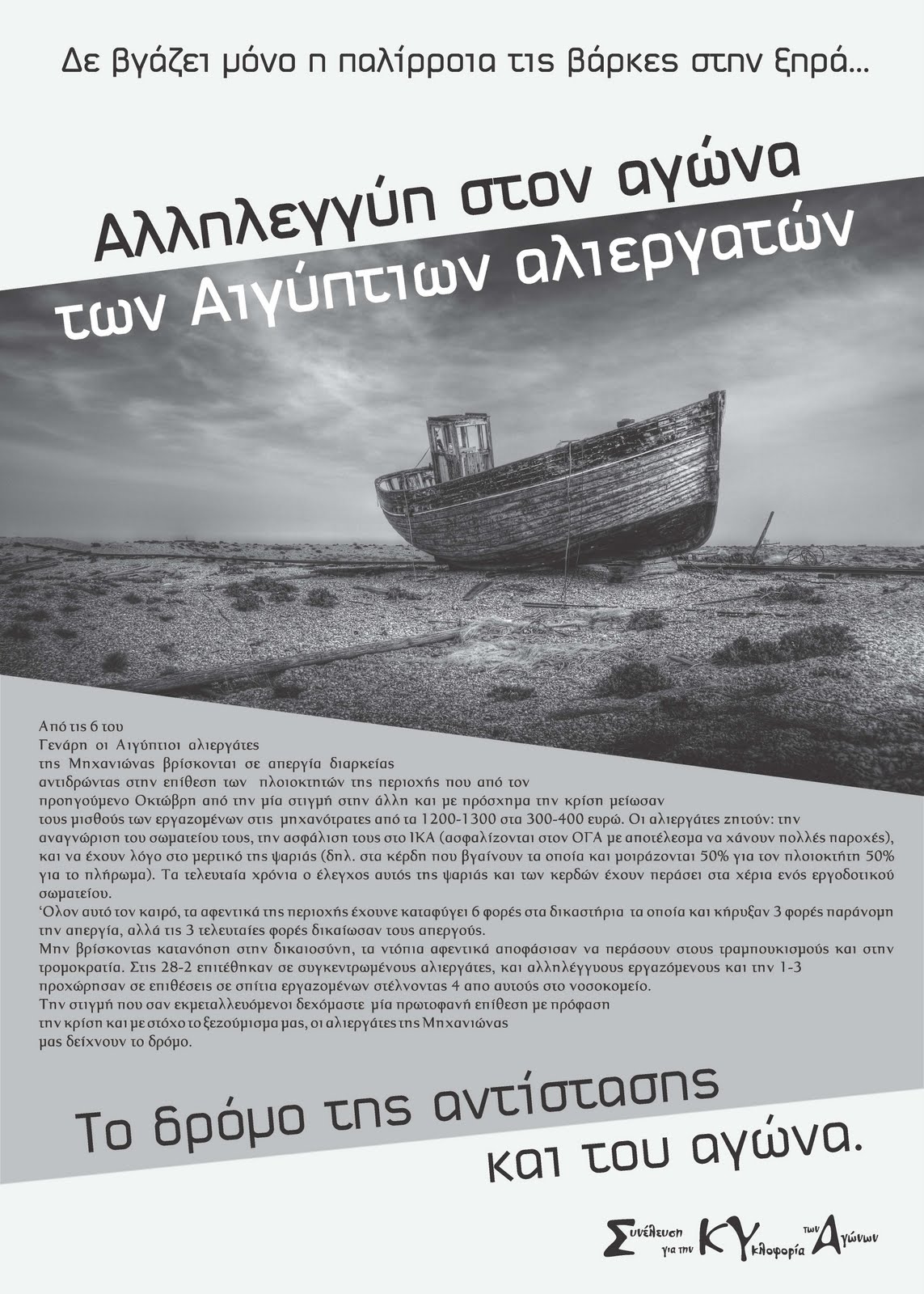 Die Bosse zwangen die Fischereiarbeiter, zu Löhnen von 300 oder 400 Euro (anstatt 1200-1300 Euro) monatlich an sieben Tagen pro Woche unter schlechten Bedingungen zu arbeiten. Außerdem wurden sie von der Arbeiterversicherungsanstalt (IKA) zu einer anderen Versicherung (OGA) umgemeldet, die schlechtere Sozialleistungen bezahlt.