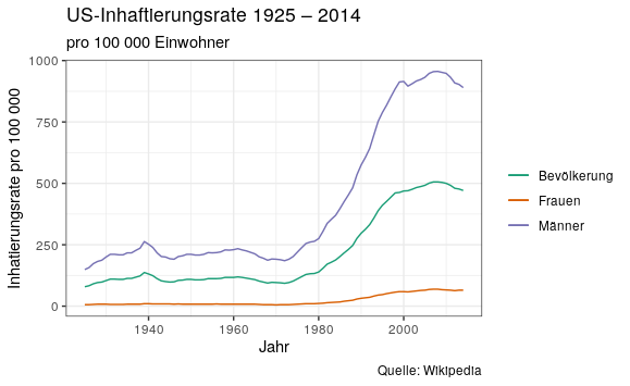 Zwischen 2000 und 2015 sank die Rate der schwarzen Inhaftierten um 24 Prozent, während die der weißen Männer leicht anstieg. Die Inhaftierung schwarzer Frauen ging um fast 50 Prozent zurück, während die weißer Frauen um 53 Prozent anstieg.