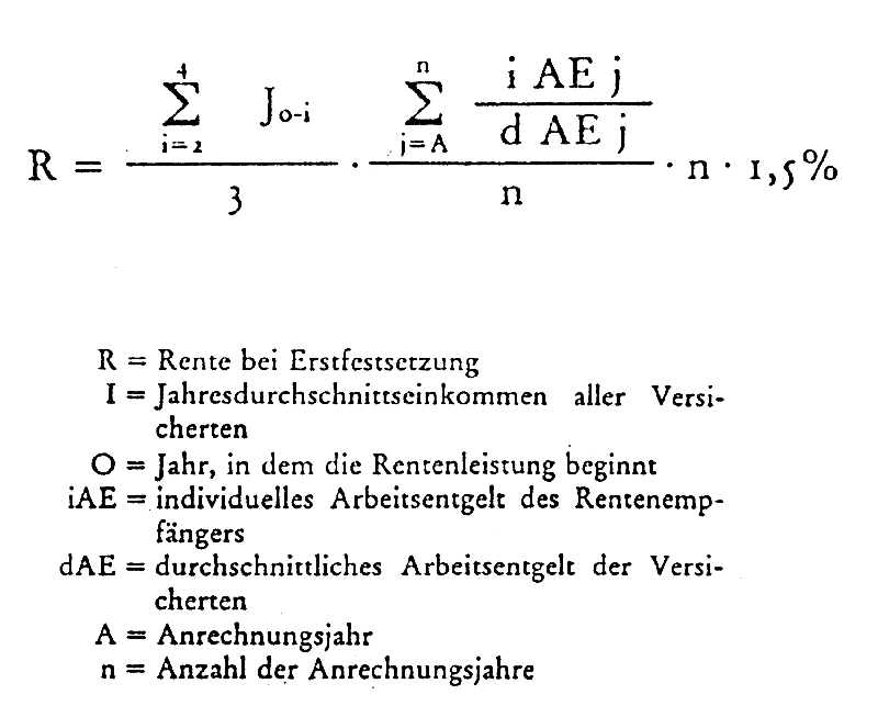 Mit dieser Formel wird die individuelle Rente an dem früheren Lohnniveau des einzelnen Arbeiters und an seiner »Lebensleistung« (im Verhältnis zur gesellschaftlich `normalen' Lebensleistung) bemessen. Das Rentenniveau wird allerdings mit dieser Formel nicht an den früheren Beiträgen zur Rentenversicherung, sondern am Durchschnittseinkommen aller Versicherten festgemacht. Durch die individualisierte Rentenberechnung wirkt hier trotzdem der Versicherungsmythos weiter.