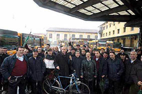 Endlich! Die Busfahrer in Italien schlagen eine andere Richtung ein. Am 1. Dezember brach überraschend in Mailand ein wilder Streik aus, dann am 11. Dezember in Rom, am 15. Dezember in mehreren Städten Italiens, schließlich am 17. ein wilder Streik von über 10 000 Alitalia-ArbeiterInnen in Rom. Wir haben den Artikel (S. 23-25) immer wieder upgedatet; bezeichnend, dass es in der BRD fast so eine Art Nachrichtensperre zu diesen Entwicklungen gab! Am 19. weiteten sich die Streiks der Busfahrer auf Savona, Neapel und Genua aus, das komplett lahmgelegt wurde. Am 20. war wieder Mailand an der Reihe – in der Nacht von Samstag auf Sonntag (20./21.12.) unterschrieben die großen Gewerkschaftsverbände einen Tarifvertrag, den die ArbeiterInnen für eine Frechheit halten. Gegen diesen Tarifvertrag gab es am Sonntag wilde Streiks in Rom, Mailand, Florenz, Brescia, Venedig und Padua. Die Reaktionen der Gegenseite wurden immer hysterischer: Bullen, Strafandrohungen. Alles bereitete sich auf den Montag, 22. Dezember vor. Als die ArbeiterInnen frühmorgens streikbereit zu den Depots kamen, wurden sie von Bullen und Gewerkschaftern empfangen. Die Gewerkschafter versuchten, vor allem die Zeitvertragler zur Arbeitsaufnahme zu erpressen: »Ihr wisst, wie hoch die Strafen sind! ...« Nun mußten wir aber definitiv in Druck gehen – während die compagni/e in Italien vor einem sehr harten Tag stehen, in dem alle Kampfmittel zum Einsatz kommen: wilder Streik, Bummelstreik (»Dienst nach Vorschrift«), Sabotage... - wir versprechen Euch schon jetzt in der nächsten Wildcat umfassende Aufklärung (derweilen lohnt es sich, auf indymedia den weiteren Verlauf zu verfolgen)! Daneben gibt es über weitere Streiks zu berichten, diesmal sogar in Österreich, der Schweiz und Deutschland! (S. 14-22)