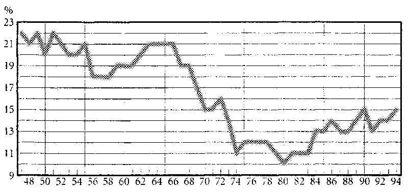 Radikale Ökonomen, ich selbst eingeschlossen, haben versucht zu zeigen, daß die Hauptursache der Stagflation der letzten Jahrzehnte ein bedeutender Fall der Profitrate in der Zeit nach dem zweiten Weltkrieg war (Weisskopf, 1979; Bowles, Gordon und Weisskopf, 1983; Wolff, 1986; Duménil und Levy, 1993; Shaikh, 1992; Brenner, 1998; ein vergleichbarer Fall der Profitrate trat in fast allen Ländern auf, für die die entsprechenden Daten vorliegen). Es gibt verschiedene Methoden, die Profitrate zu bestimmen, aber alle zeigen im Kern den selben starken Abwärtstrend in dieser Periode. [1] Nach meinen Schätzungen, die in Abbildung 2 dargestellt sind, sank die Profitrate um 45 Prozent - von 22 Prozent Ende der 40er Jahre auf 12 Prozent Mitte der 70er Jahre. [2]