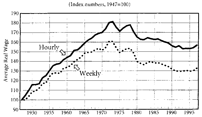 Die entgegengesetzten Entwicklungen der Reallöhne dieser beiden Perioden - 60 Prozent Steigerung und dann 17 Prozent Rückgang - sind vielleicht das deutlichste Zeichen für den Übergang von der Prosperität zur Stagflation. Diese Trends sind in Abbildung 1 grafisch dargestellt. Harrison und Bluestone (1986) haben diese Umkehrung der Entwicklung die »große Wende der Löhne« genannt. Man kann sehen, daß die durchschnittlichen Reallöhne 1995 auf ungefähr dem gleichen Niveau sind wie 1965. Das erneute Anwachsen der Reallöhne hat nur einen kleinen Teil der Verluste seit 1973 wettgemacht.